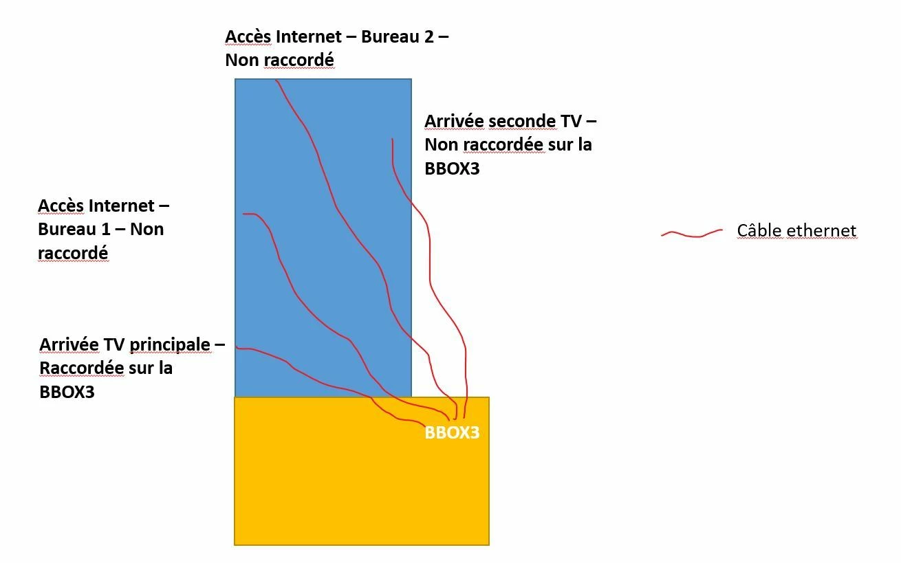 Je me permets de joindre un schéma très succint de l'état initial ainsi que du statut à savoir une BBOX3 dans le garage d'une maison entièrement en ossature bois et pour laquelle uniquement la TV principale est raccordée en mode filaire (RJ45).