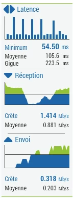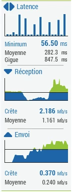 Voici 2 tests (en wifi avec décodeur branché, par câble c'est exactement pareil puisque ma connexion est moins rapide que celle d'un wifi) pour exemple. Il y en a un bon et un mauvais, la plupart du temps, ça se situe entre les 2.