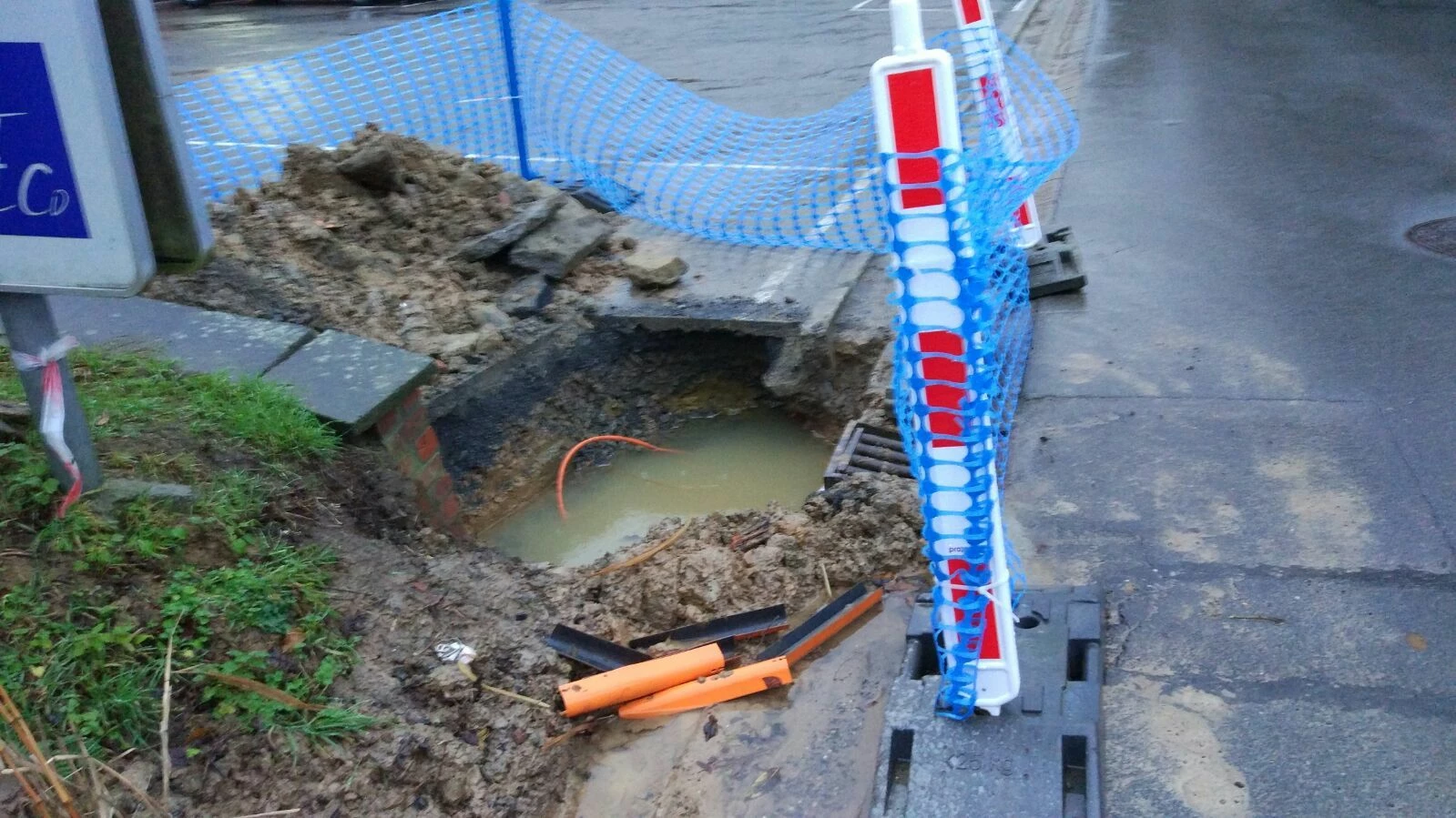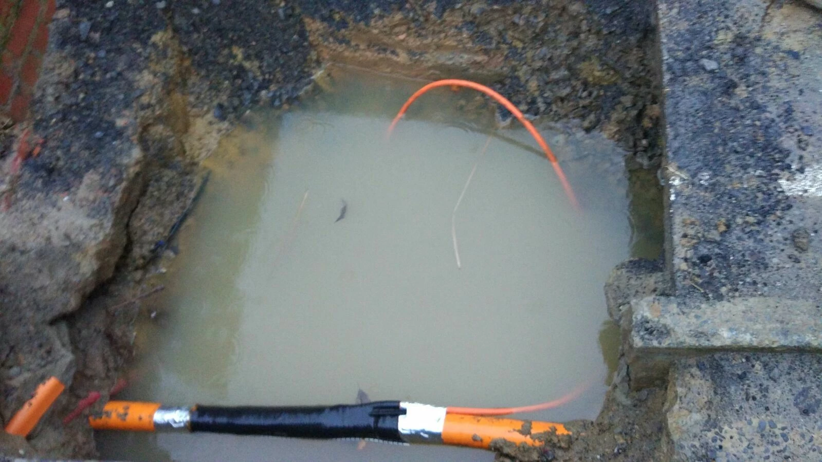 Le problème étant sous le trottoir, et le cablage qui a été bâclé et le trou dans la rue refermé après 2 mois (voir photo), les câbles ayant bien pris l'eau.