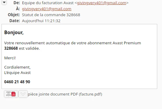 Depuis quelques semaines un mail circule vous invitant à payer une facture pour l’anti-virus Avast.