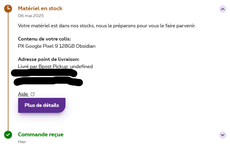 J'ai effectué une commande sur votre site internet d'un Google Pixel 9, la commande a été payée mais je n'ai pas reçu de mail de confirmation. De plus la date de la notification “Matériel en stock” est daté du 06 mai, hors je l’ai commandé le 30 avril.