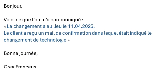 Le 11 avril 2025, un agent de PROXIMUS, derrière son PC a décidé de basculer ma ligne fixe cuivrée (prise PROXIMUS - 5 broches) en une ligne IP (RJ45 sur B-BOX).