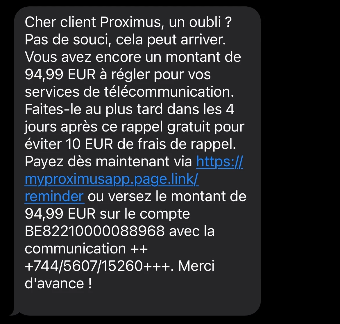 Récemment j’ai eu pas mal de soucis financiers, je suis étudiante et ce n'est déjà pas évident pour moi de régler tous les mois 54,99€ (sachant que comme toujours vous vous amusez à augmenter les prix), mais je fais en sorte chaque fois de régler mes factures. Mes problèmes financiers récents m’ont empêché de régler ma facture à temps donc j’ai eu une facture de rappel avec des frais exaspérant comme toujours de 40€, donc je dois régler 94,99€ pour demain pour éviter 10€ de “frais de rappels” ce qui me reviendrait à 104€ ce qui est littéralement énorme pour un simple retard en sachant que mon abonnement se termine dès le 1er octobre. Façon sympa de terminer son abonnement chez proximus après deux ans.