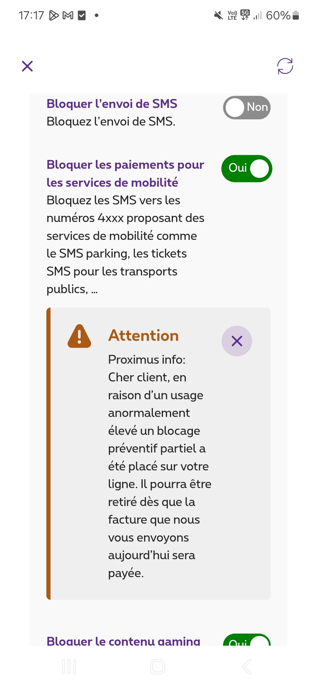 Bonjour Il est impossible d'activer les paiements mobile mon abonnement est payer , avant j avais une esim j suis passer en boutique échanger mon esim par une carte sim physique dans my proximus Bloquer les paiements pour les services de mobilité et sur " ON " est quand j essaye de le mettre sur " OFF " voici le message écrit : Cher client, en raison d’un usage anormalement élevé un blocage préventif partiel a été placé sur votre ligne. Il pourra être retiré dès que la facture que nous vous envoyons aujourd’hui sera payée.