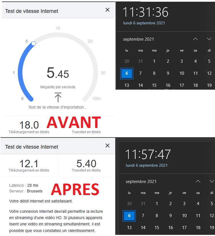 De plus, j’habite une ville d’une bonne taille et mon débit internet est de 17mbits/s ce 31/08/21 alors que mes voisins disposent du triple chez Orange. Je dispose quand même d’un abonnement de 60€/mois !!!
