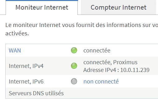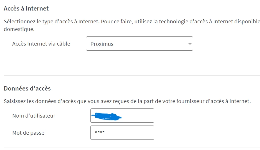 Bonjour, je tente de remplacer un ancien router tplink connecté via ppoe et le user proximus et psw par un fritzbox 4060. Je le configure en choisissant Proximus et en entrant le user et psw. Il dit qu’il se connecte mais reçoit une adresse ip commençant par 10.x.x.x. Et en réalité, je n’ai pas vraiment de connexion internet : pas de dns, etc….