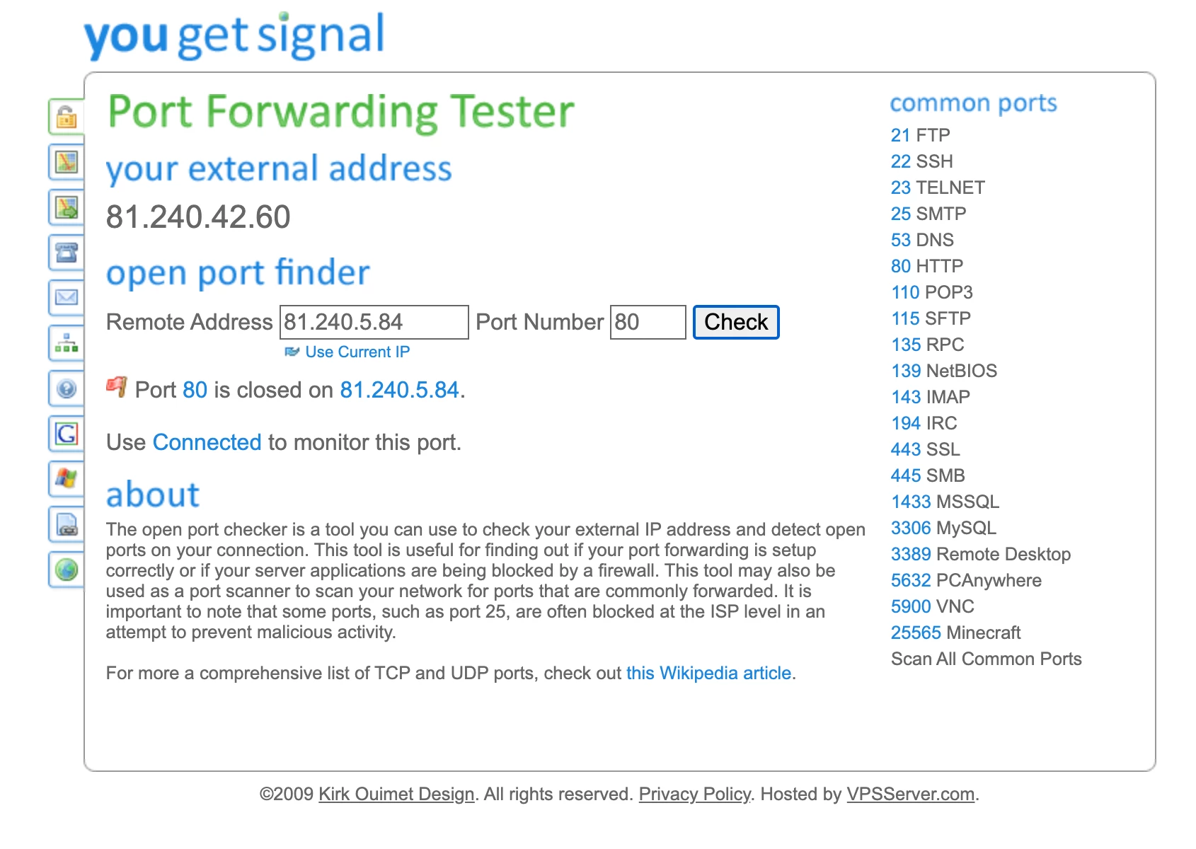 J’essaie depuis quelques jours de rendre à nouveau mon serveur privé visible depuis internet en ouvrant les ports 80 et 443. Le serveur ne fonctionne plus actuellement qu’en local via adresse IP interne à mon réseau domestique, mais n’est plus visible depuis internet via mon nom de domaine.