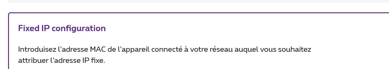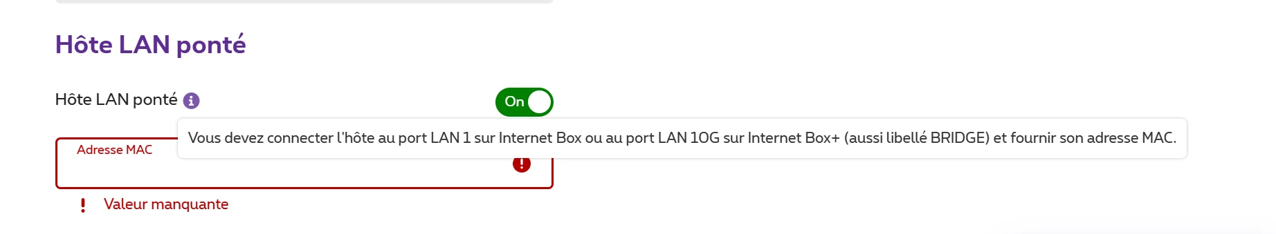 Je dispose d’une Internet Box+ avec option IP fixe, mais je n’arrive pas à récupérer mon IP fixe sur mon routeur via le mode hôte LAN (bridge).