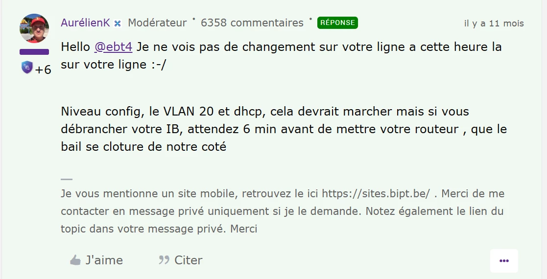 À ce stade, et d’après le suivi de mon ticket (2461007427), il semblerait que le problème vienne du matériel, puisque même le technicien de niveau 2 n’a pas réussi à obtenir l’IP fixe.