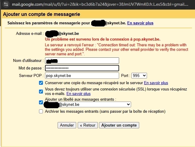 Bonjour, comme j’utilise Gmail et Skynet régulièrement, j’avais jusqu’hier matin la possibilité dans Gmail de rapatrier mes mails de Skynet vers Gmail. Depuis Hier PM plus moyen, j’ai enlever le compte dans importation de Gmail mais quand je veux le remettre j’ai un message d’erreur. Est-ce que ce système a été bloqué ? Pour info testé sur plusieurs PC et même résultats. J’ai également tenté le transfert depuis ma boîte Skynet vers Gmail, mais là je ne reçois plus rien, les mails ne sont pas transférés et n’arrive jamais ni sur skynet, ni sur gmail. Est-ce que quelqu’un d’autre a le même souci. Merci d’avance pour vos réponses.
