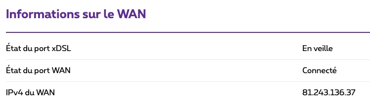 J’ai une internet box+ et my proximus m’indique que la box n’est pas joignable. Dans information l’IP indiquée n’est pas celle de ma box (je suppose que le souci vient de là). Je dispose d’une IP fixe qui est attribuée à la box (si je vais sur whatsmyip.com je vois bien mon ip fixe) mais l’IP affichée sur myproximus ne correspond pas.