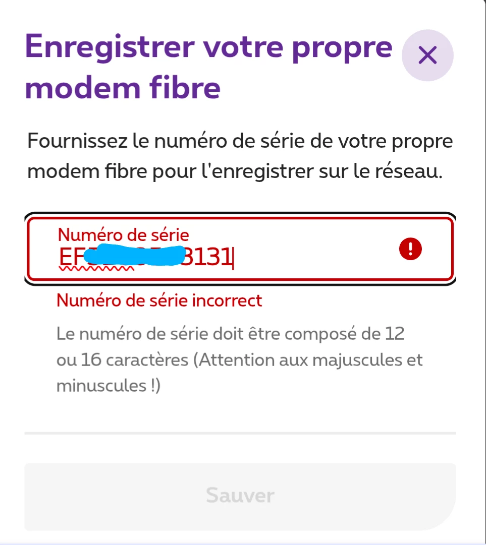 Mais quand je veux renseigner soit le numéro de série du modem, soit le numéro de série du SFP, cela me dit "numéro de série incorrect".