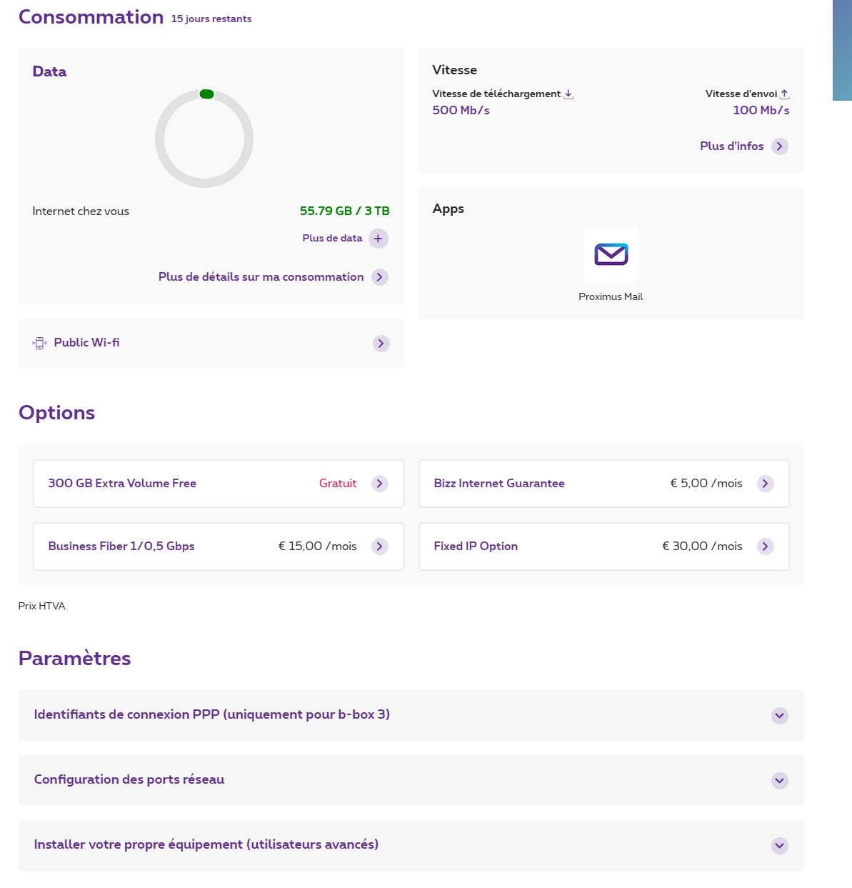 Je n’ai pas accès au bouton de configuration “Paramètre de votre internet box” depuis mon compte My Proximus sur un Bizz Internet Fiber.