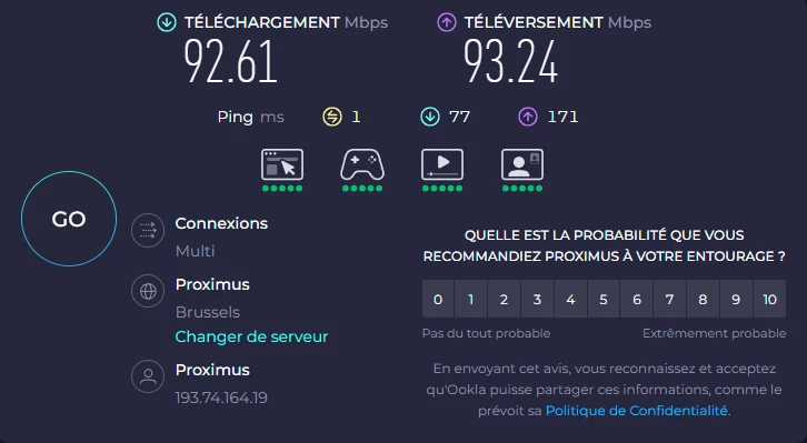 je suis passé ce jour de Mobile Viking (Fibre 1/0.5Gbps) à Proximus Flex Giga Fiber (2.5/0.5Gbps).