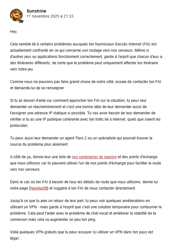 @Hidaoui Anas, nous comprenons que la situation soit compliquée pour certains. Nous avons un contact chez Riot Games, mais pour l’instant il n’a pas pu résoudre le souci. Le problème, c’est que Riot ne veulent pas communiquer pas sur la manière dont ils gèrent le routage interne de leurs jeux. Comme il existe plusieurs chemins possibles entre nos réseaux, il est difficile d’expliquer pourquoi la solution qui semble la plus logique techniquement pose problème pour leurs joueurs.