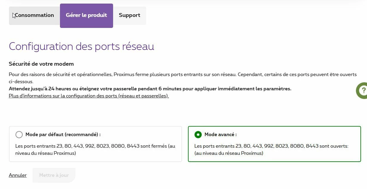 Internet box en mode Bridged, ports en mode avancé ouverts. Mon firewall interne (pfsense) a bien une IP publique. Les ports non standards entrants arrivent bien sur mon firewall mais pas le 443. Je vais tester ce matin les autres ports. Un appel chez Proximus n’apporte aucune réponse alors qu’il me semble que c’est leur JOB. J’ai plusieurs pfsense sur plusieurs batiments, le seul qui déconne c’est celui qui est connecté chez Proximus. Tous les autres fonctionnent avec EXACTEMENT la même config.