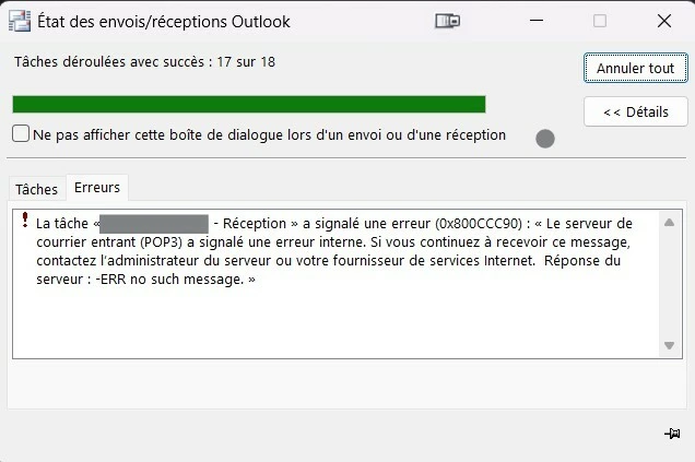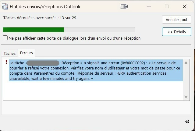 Depuis ce matin, le mardi 18 novembre 2025, il est impossible d’envoyer des mails avec Outlook 365. La réception des mails est très lente, il semble qu’il y ait un problème de synchronisation dont le temps restant ne cesse d’augmenter (voir photo jointe).
