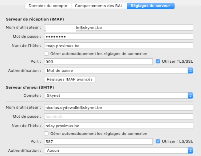 Courrier entrant :imap.proximus.be - Port 993 - Chiffr. SSL/TLS