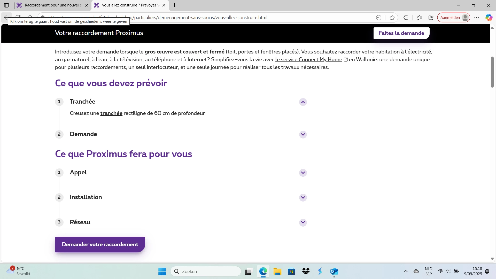 Nous sommes en train de construire le gros œuvre fermé. Nous souhaitons effectuer les démarches nécessaires pour la connexion au réseau Proximus. La buse est déjà en place et arrive jusqu’à l’intérieur de la maison.