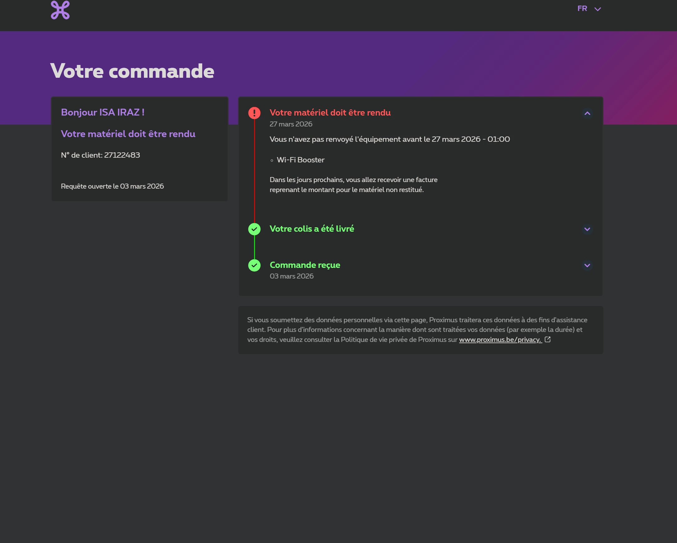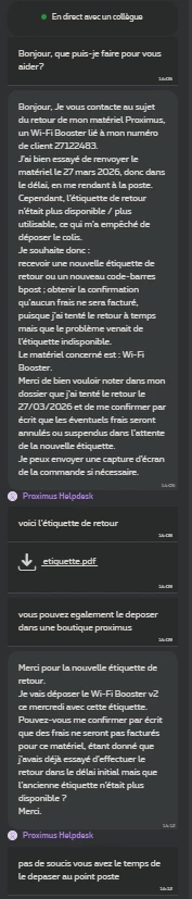 J’ai ensuite contacté le helpdesk Proximus par chat. Une nouvelle étiquette de retour m’a été envoyée et je vais déposer le matériel ce mercredi au point poste.