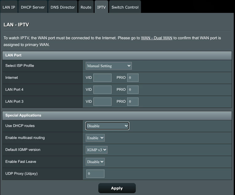 J'ai une Internet Box et jái placé derriere mon routeur ASUS RT-AX58U pour avoir du mesh dans la maison avec d'autres routeurs RT-AX53U. J'ai defini le routeur sur MyProximus, l'internet box est en bridge sur le port LAN1, tout fonctionne a merveille. Je suis en singleVlan.