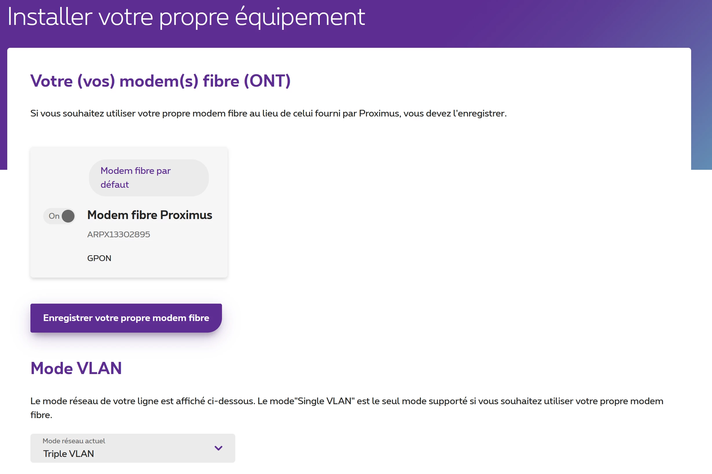 J’ai mis ma connexion en single VLAN, puis essayé de connecter le routeur directement au boitier de la fibre. Je n’arrive pas à savoir si les paramètres proposés sont suffisants dans l’interface du modem, ni si les paramètres changés dans l’interface proximus étaient corrects.