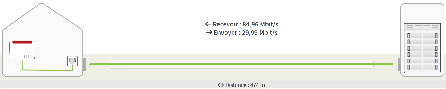 Actuellement, le ‘download’ ne dépasse jamais 68,4 Mbit/s et le ‘upload’ lui est resté à 29 Mbit/s. La capacité de ma ligne est de ±108183 kbit/s à la réception et ±35398 kbit/s à l’envoi. Le DSLAM max en réception est de 70000 kbit/s et de 30000 kbit/s en envoi. La borne de connexion est à ±474 mètres de distance.