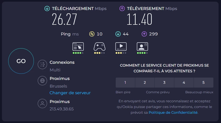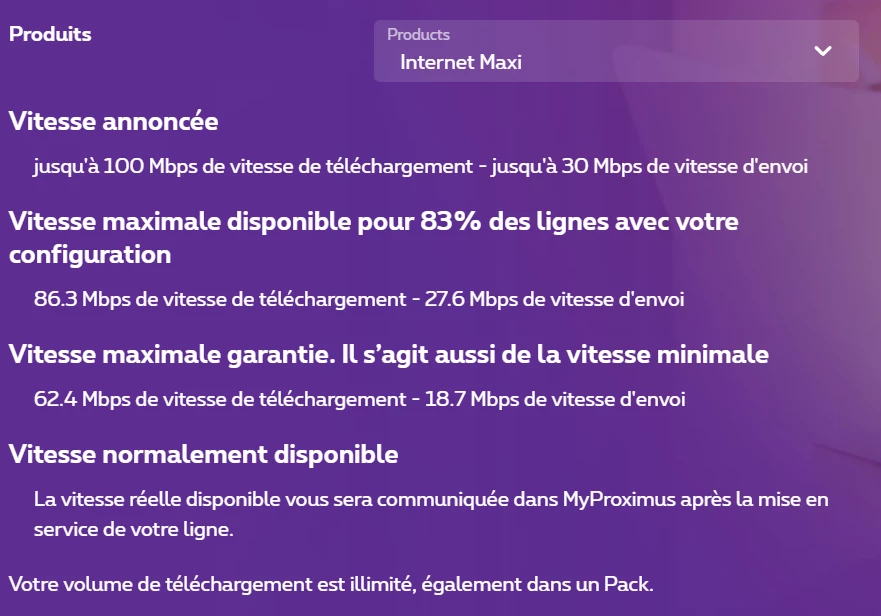 D’après les informations de Proximus, la vitesse maximale prévue est de 100 Mbps en téléchargement et 30 Mbps en envoi.
