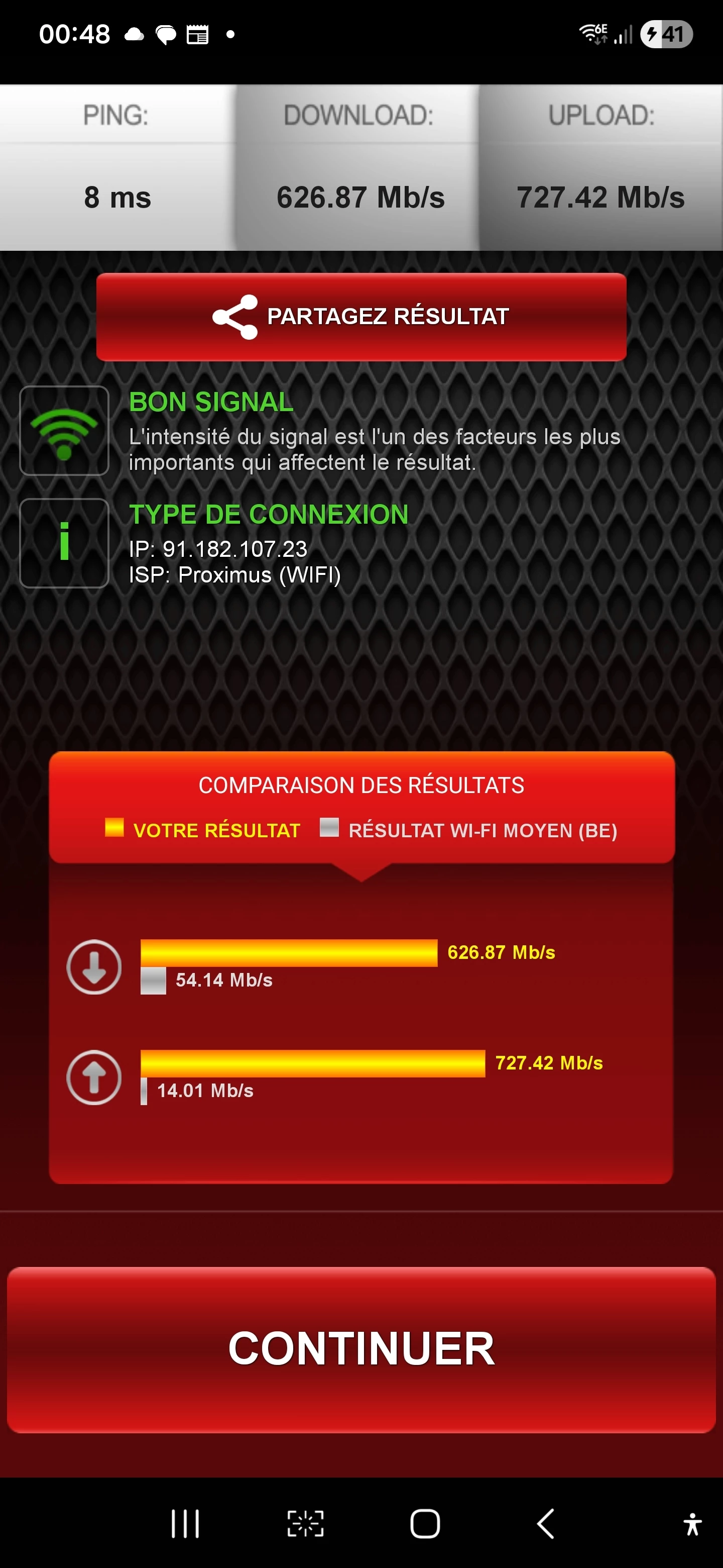 En soirée je tourne vers les 700 en dowload, depuis le 20/01/2026 je suis en attente que l’ont régle le problème, ont m'a proposer une réduction sur la facture dont je ne suis pas intéressé, j’ai demander un service que je suis loin d'obtenir, donc je ne pense pas qu'il faille plus d’une semaine pour débrider ma ligne car oui vous brider les ligne, sinon comment expliquer que le même test chez un concurrent qui utilise la même ligne proximus, qui est beaucoup plus éloigné de la borne avec un abonnement de 1gb et mes appareils obtiennent une vitesse de 980 en téléchargement en pleine journée ,ce n’est pas très honnête vis à vis de client qui paie pour avoir le service voulu