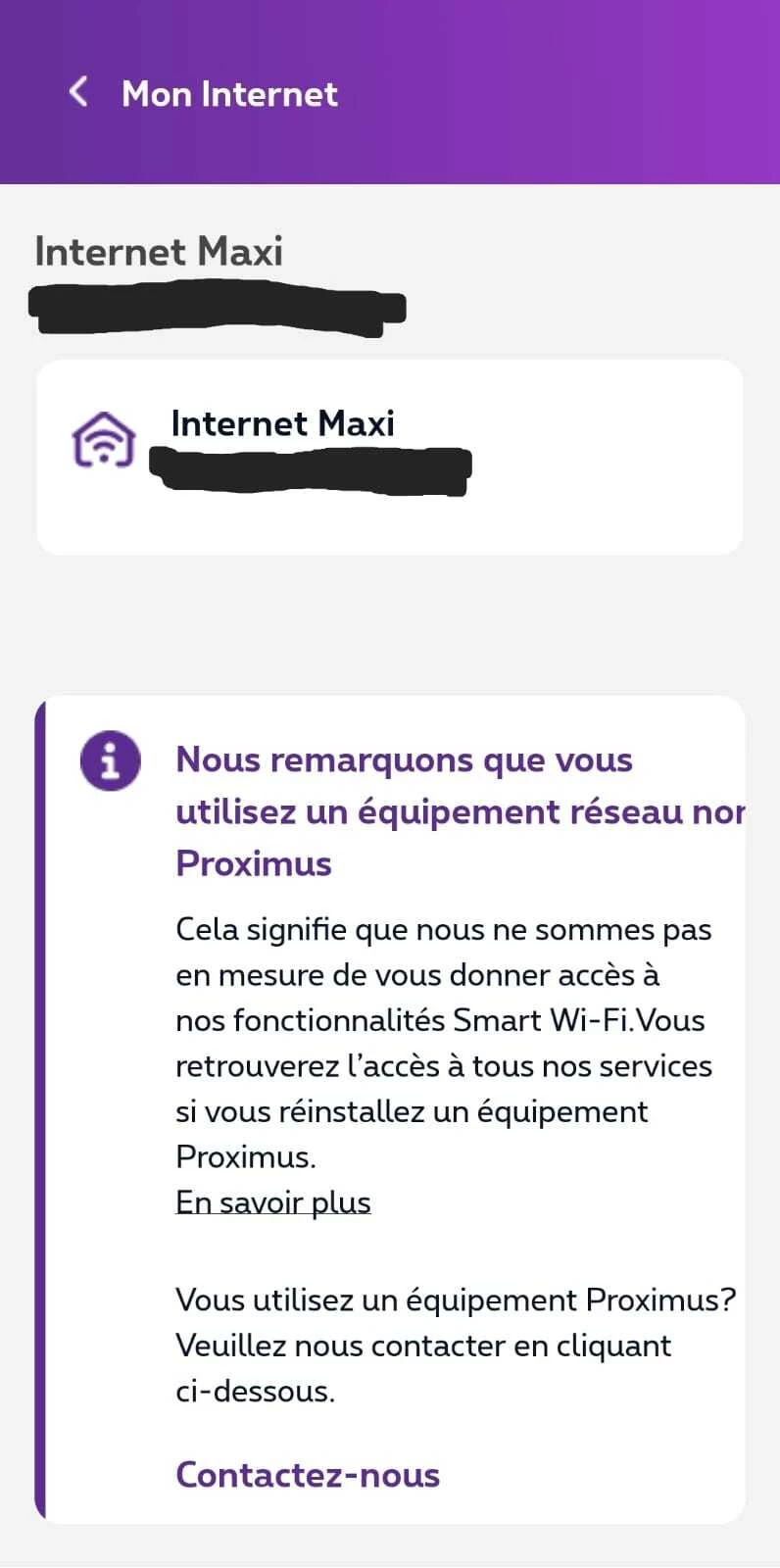 Je reçois comme message d’erreur ‘service indisponible’ et ensuite ‘nous remarquons que vous utilisez un équipement réseau non Proximus’, par conséquent pas en mesure de donner accès à nos fonctionnalités Smart Wi-Fi.