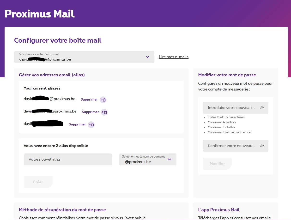 Chose étrange, pour certaines adresses, Proximus a généré un alias avec le même nom que l’adresse d’origine.