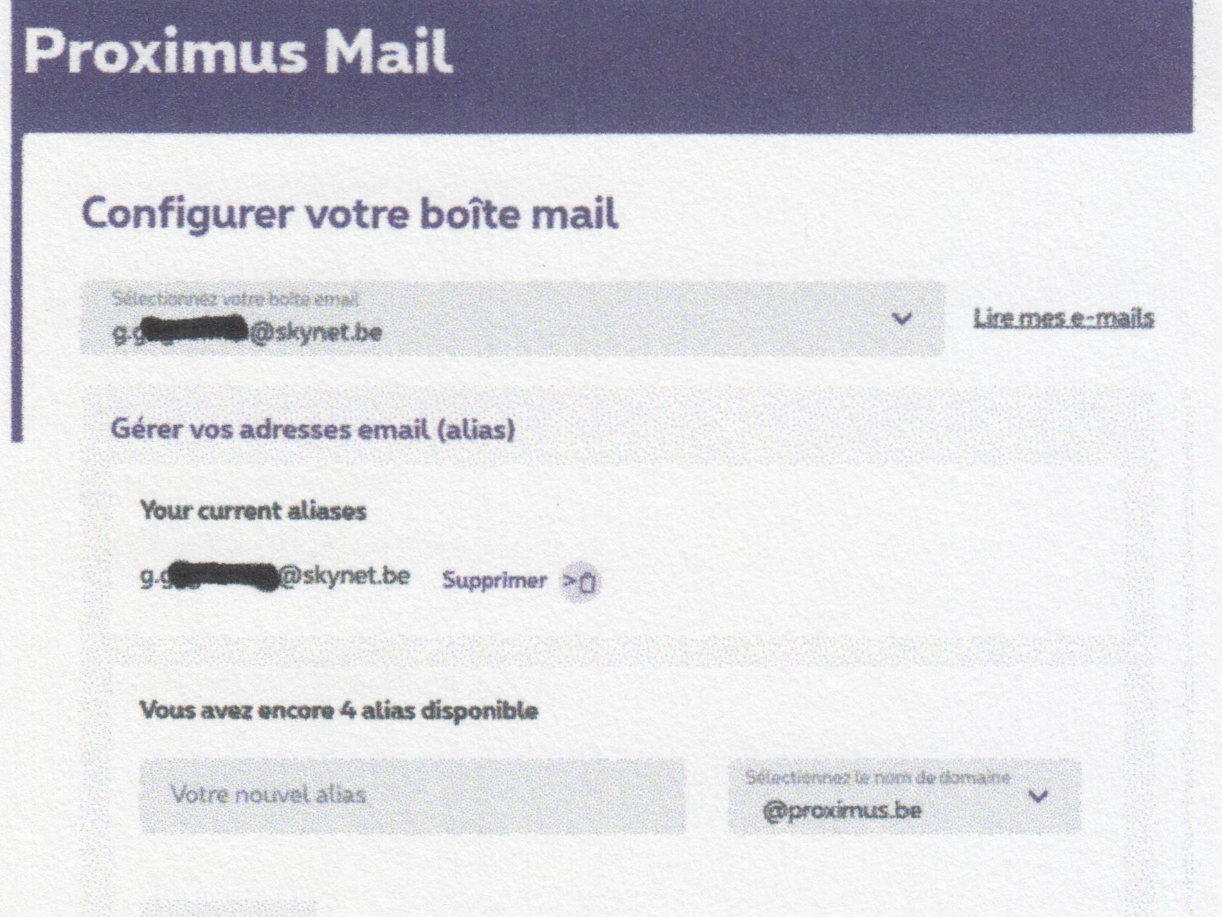 J’ai tenté de supprimer l’alias e.bxxxxx, ce qui a également supprimé l’adresse d’origine. J’ai recréé l’adresse e. bxxxxx, un alias a automatiquement été généré ainsi qu’une nouvelle adresse mb8xxxx@proximus.be
