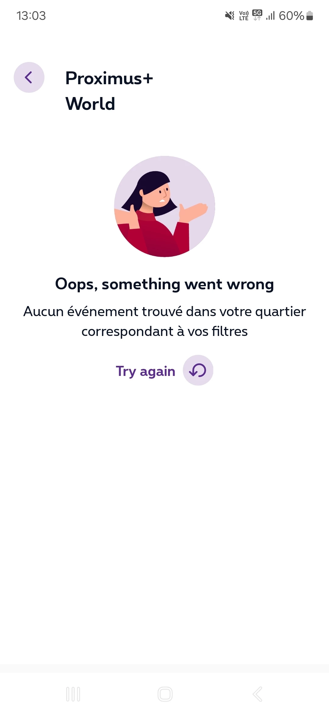 Avez vous également des problèmes aujourd'hui pour vous connecter a proximus world? J'ai éteins et rallumer le gsm. Dupprimez et réinstallé l'app Proximus + et toujours rien. chaque fois un message d'erreur apparait. Toujours cette erreur alors que je n'ai activé aucun filtre ni jamais essayé de rechercher quelque chose dans mon quartier.