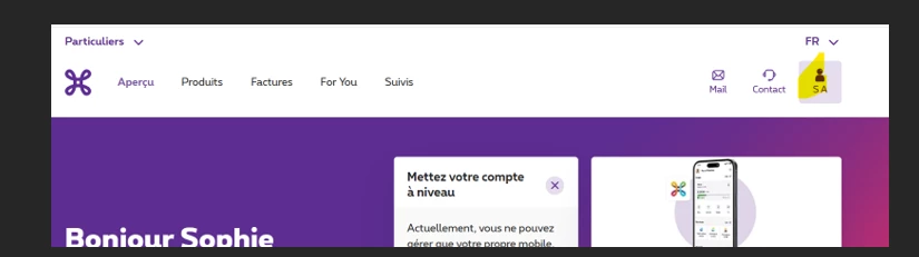 - Deuxièmement, vérifier si vous avez un bouton en haut à droite qui vous permet de switcher de votre mobile vers vos produits fixes ?