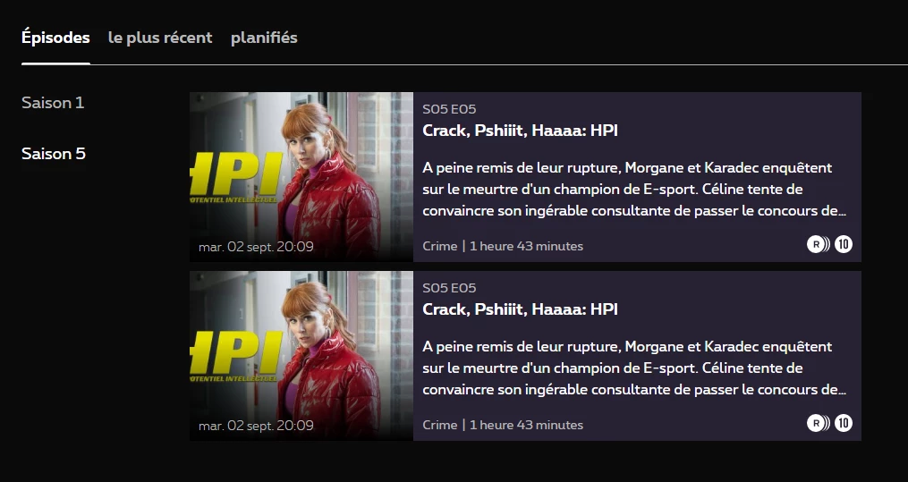 - la deuxième émission du 24 juin (19h10) était bien enregistrée et lisible jusqu’à ma discussion avec le chat de Proximus hier... Celle-là, c’est votre collègue du chat qui l’a supprimé lui-même en disant “pour celui du 24, je vais l’annuler et le réinjecter à nouveau”. Sauf que visiblement, il n’a rien compris puisqu’au lieu de réinjecter l’émission manquante du 24 juin 18h40, il a d’abord supprimé l’émission du 24 juin 19h10 (existante, lisible). Et au lieu de remettre ensuite les 2 émissions du 24 juin (18h40 et 19h10), il a remis une émission récente (30 aout 19h10), que j’ai déjà vue, supprimée et que j’ai pas demandé à remettre…?... Donc grâce à son intervention, non seulement j’ai perdu un épisode qui était lisible, mais j’ai pas non plus récupéré celui qui était manquant à la base et qu’il comptait “réinjecter” aux côtés de celui qu’il avait supprimé…