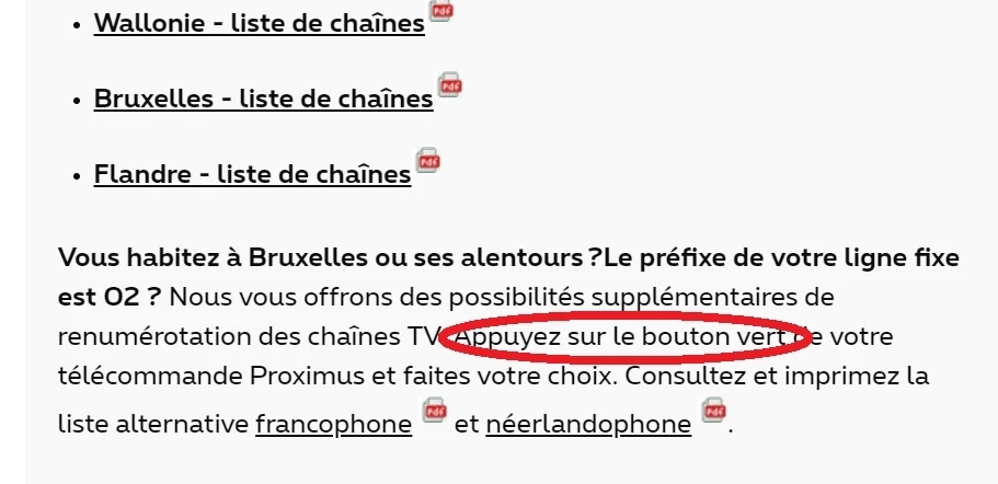 Vous habitez à Bruxelles ou ses alentours ?Le préfixe de votre ligne fixe est 02 ? Nous vous offrons des possibilités supplémentaires de renumérotation des chaînes TV. Appuyez sur le bouton vert de votre télécommande Proximus et faites votre choix. Consultez et imprimez la liste alternative francophone (.pdf) et néerlandophone (.pdf).