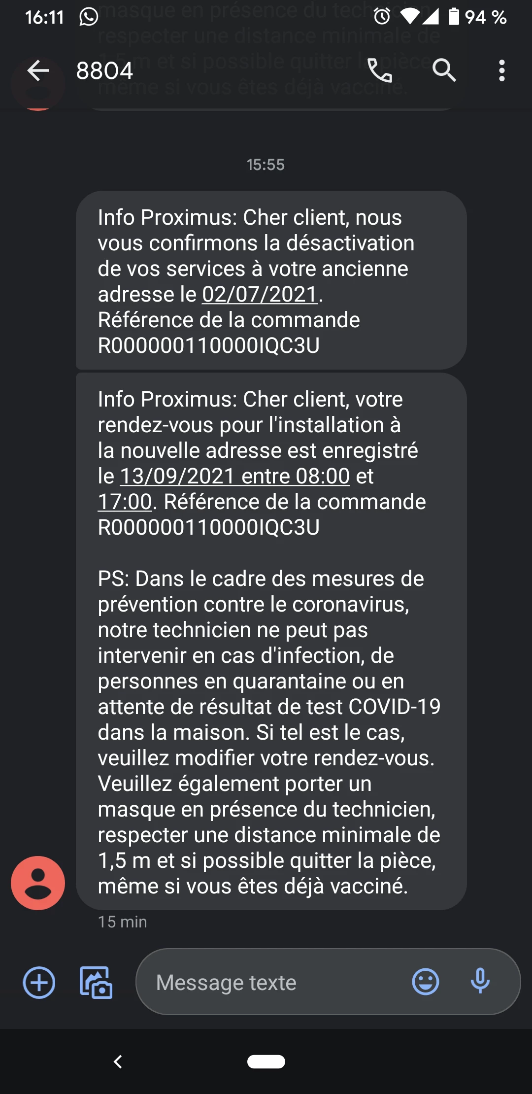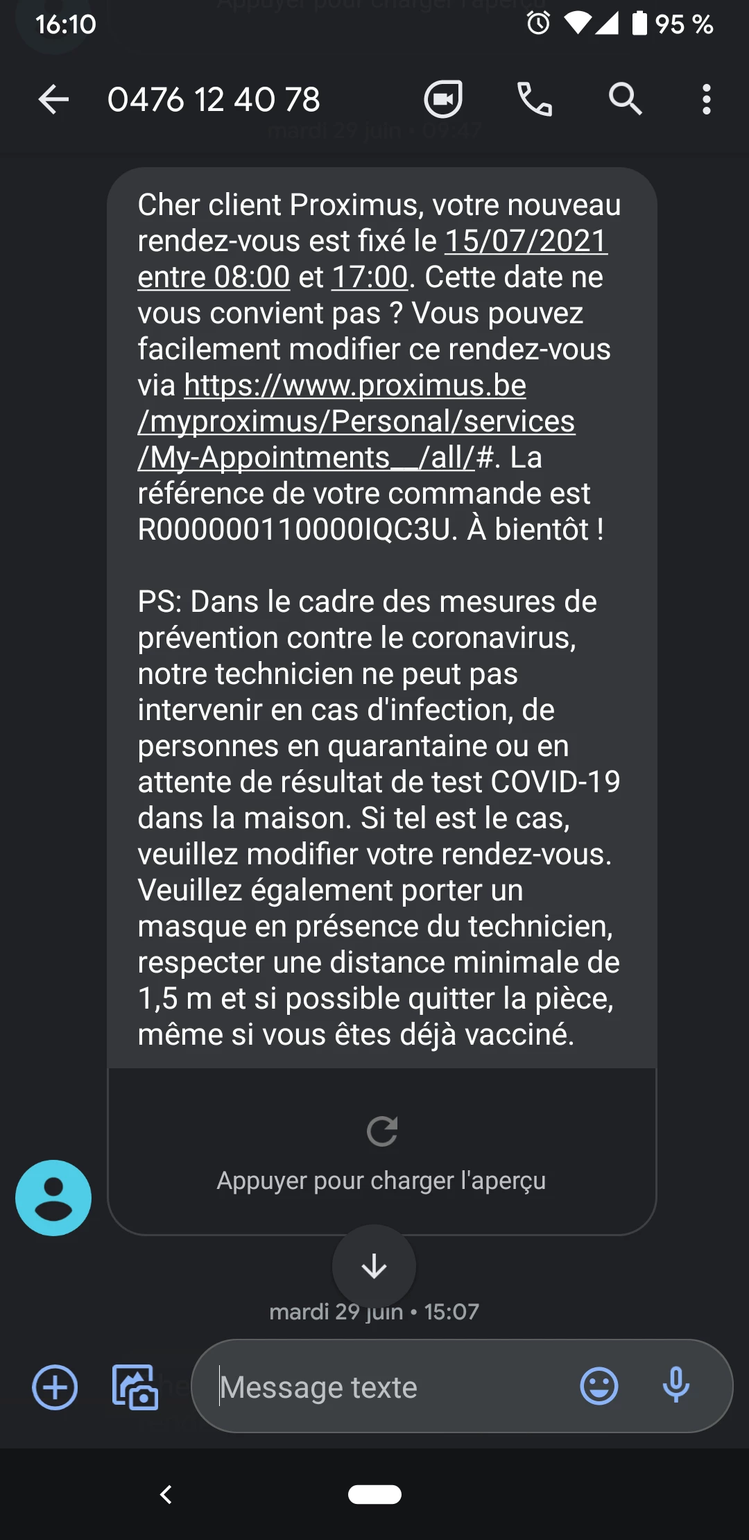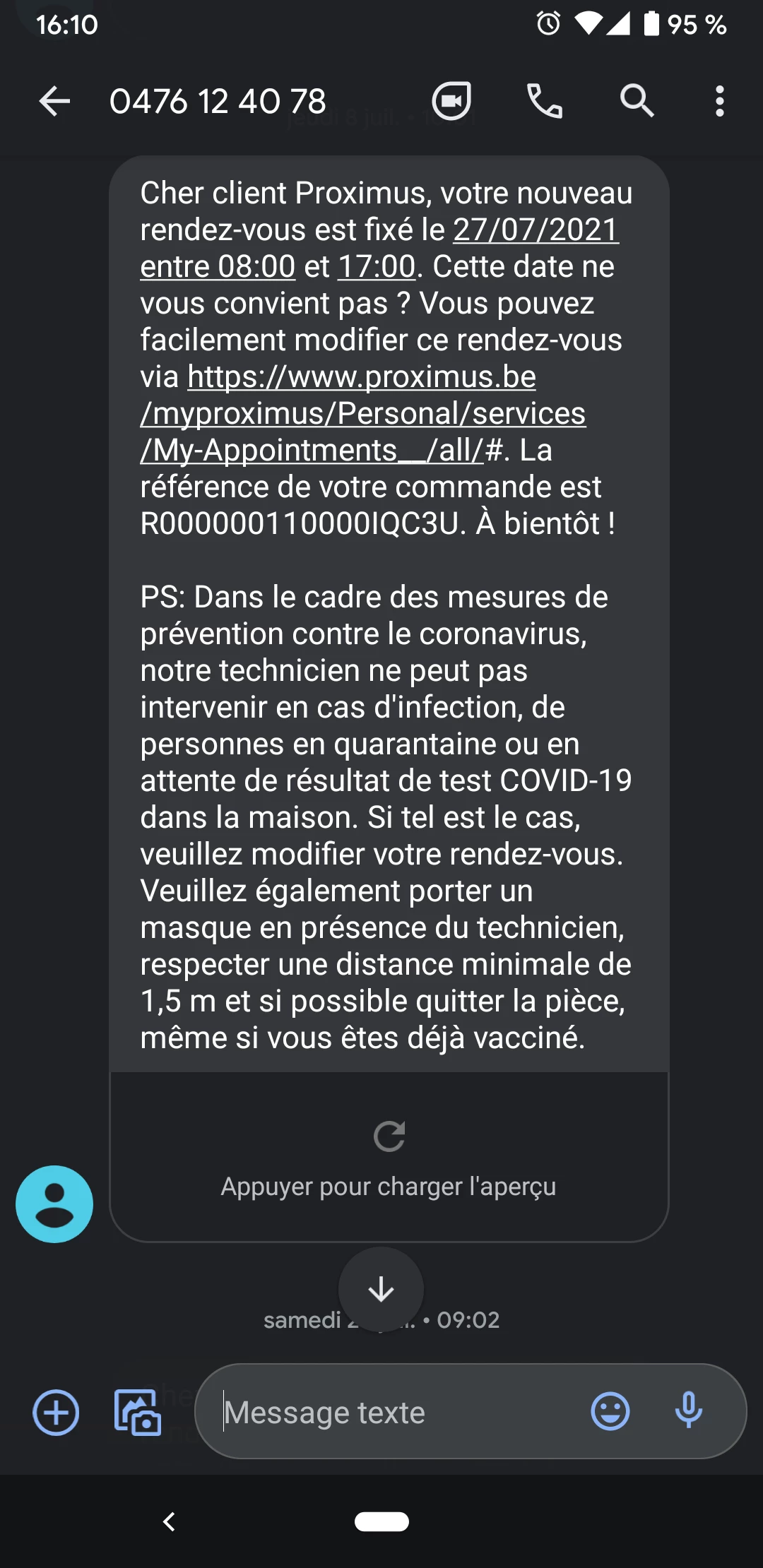 Après avoir contacté le chat Proximus, on me donne finalement un rendez vous le 02 Juillet.