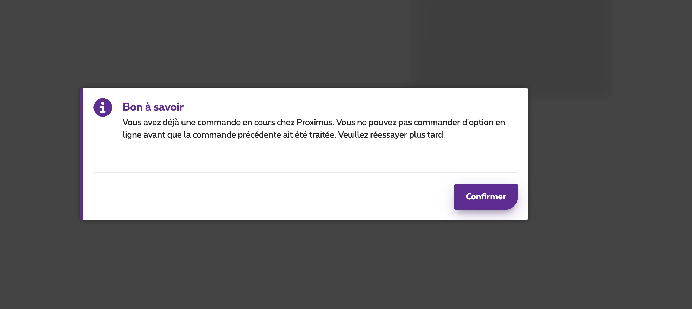 Je me suis dit qu'il y avait certainement un bug causés par le nombre de personnes qui étaient connectées pour précommander les nouveaux iPhone. J'ai réessayé de précommander l'iPhone, et j'ai reçu un popup me disant que j'avais déjà une commande en cours chez Proximus.