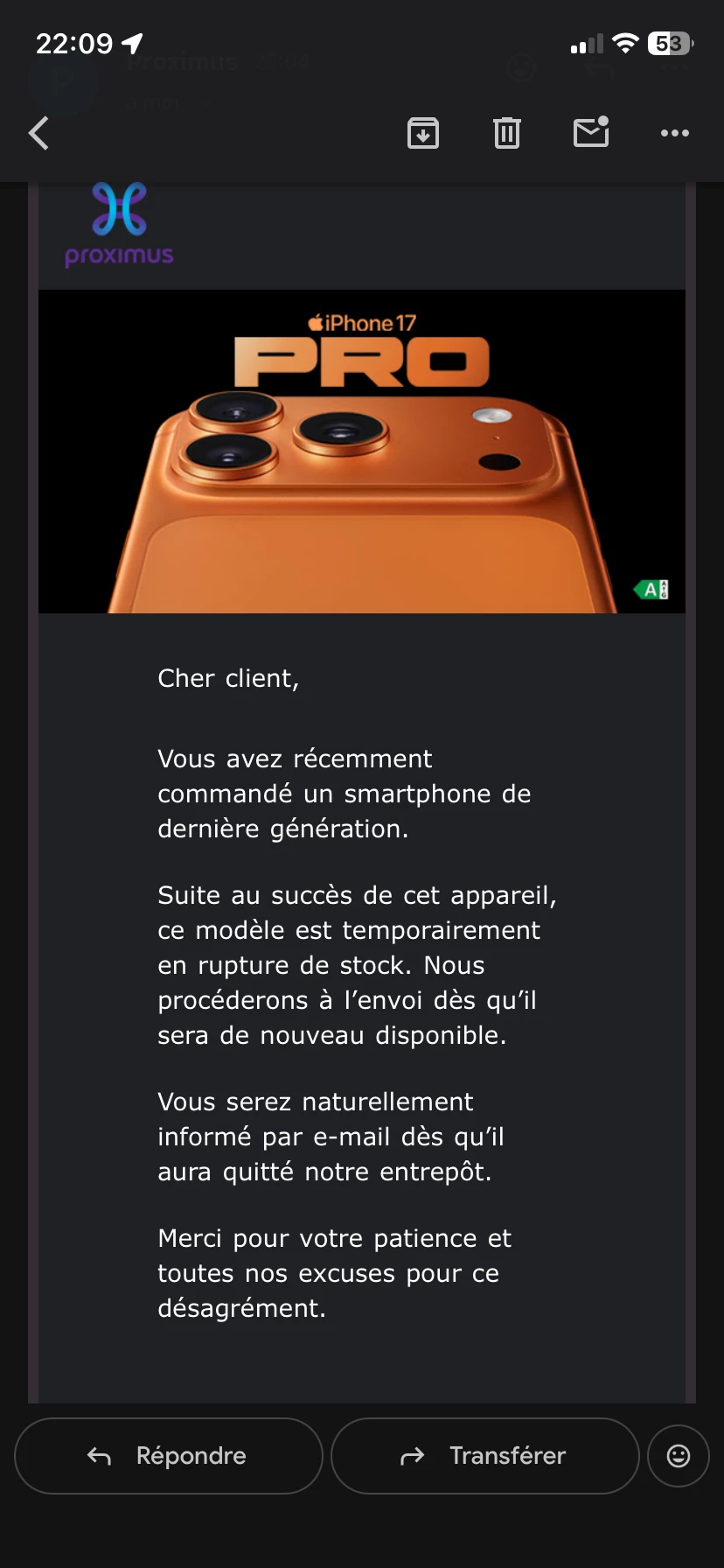« Je vous remercie pour votre patience. En fait, je n'ai pas encore de date de livraison pour votre iPhone. La livraison des iPhone 17 précommandés dépend de la disponibilité des stocks, qui est déterminée par Apple. Comme chaque année, Apple ne garantit pas les quantités de stock par modèle, ce qui peut entraîner des délais pour certains clients. Proximus fait tout son possible pour minimiser ces délais et informera les clients dès que les stocks seront disponibles. La majorité des précommandes est généralement livrée en moins d'une semaine.