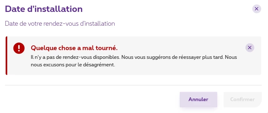 Bonjour est il possible d'avoir un rendez vous pour l'installation de la fibre ?? Le mail que j'ai reçu ne me permet pas d'avoir un rendez vous et ce met en erreur et quand je sonne à proximus ils ont incapable de me donner ne serait ce qu'une date ? Que dois je faire merci