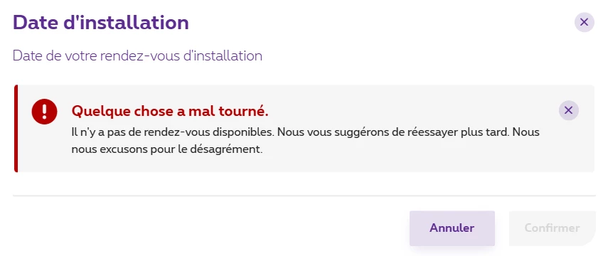 J’ai reçu le lien pour choisir une date afin que le technicien passe à mon domicile pour l’installation de la fibre. Toutefois, je reçois sans cesse ce message d’erreur: