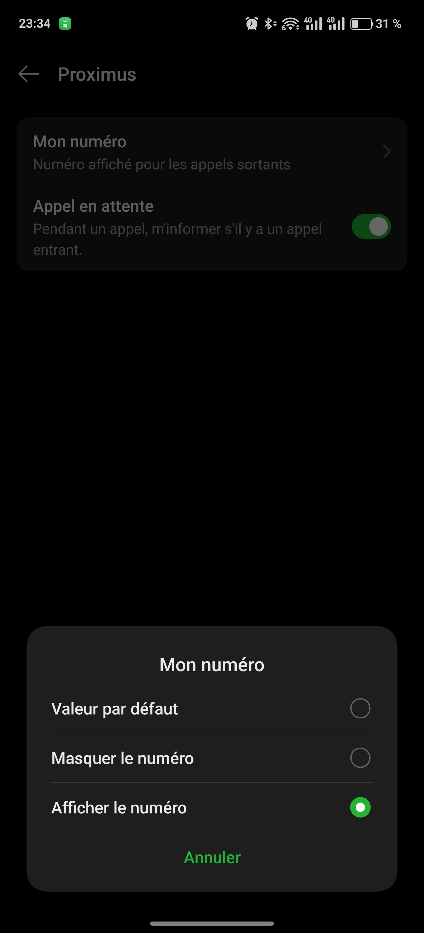 Trouvé l’option intéressante avant d’avoir compris que masquer le numéro de façon occasionnelle pouvait se faire simplement par #31# ...le menu semble dire que ceci n’est possible que si l’option est activée. En fait, il semble qu’activer l’option ne “permet” pas juste “de masquer votre numéro de GSM” mais le masque systématiquement (sans exception possible via #31* comme sur ligne fixe).