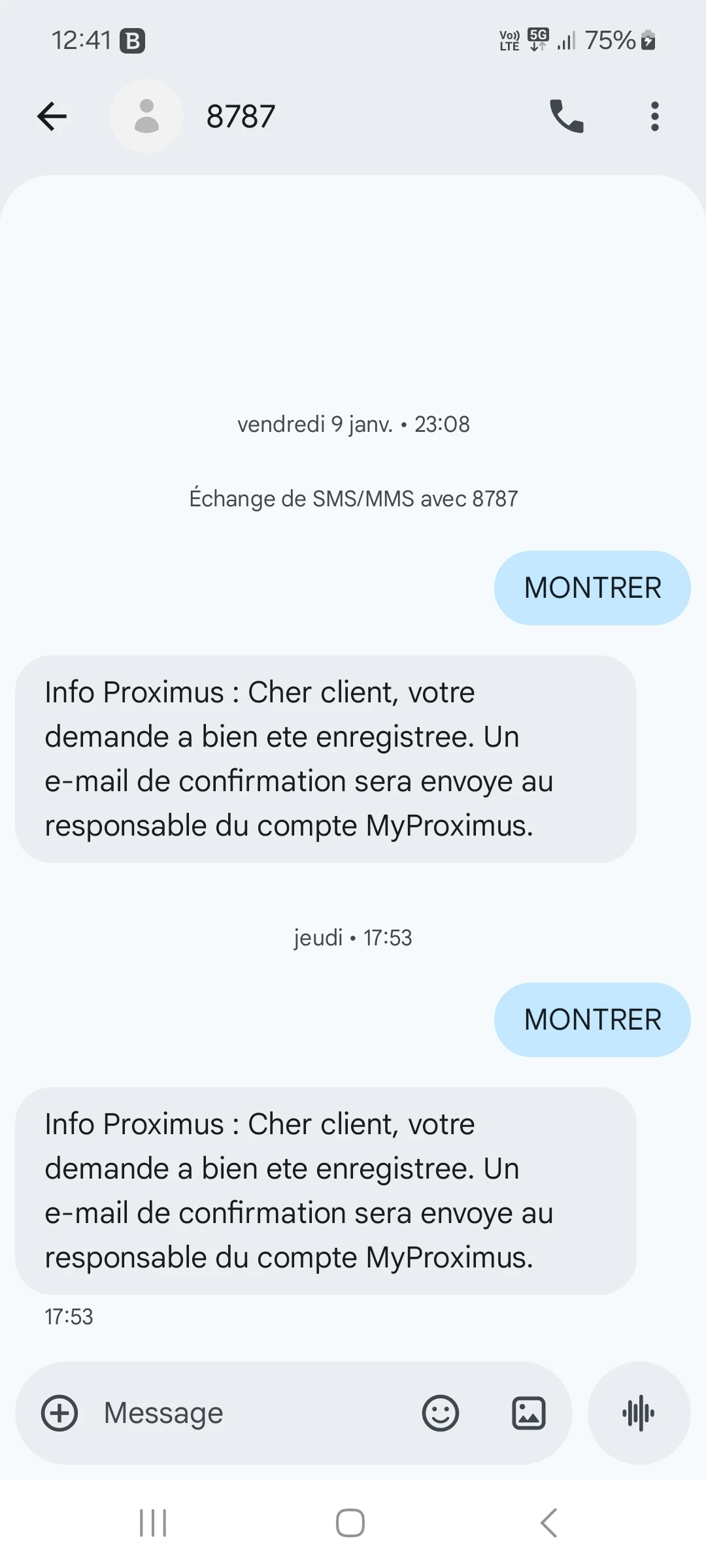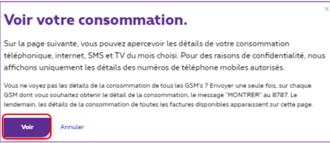 Ayant malencontreusement effacé l'historique des communications sortantes du mois de décembre, j'ai envoyé MONTRER au 8787 en sms sur le portable en question par deux fois sans jamais recevoir la moindre réponse. J'ai bien reçu le retour de Proximus m'informant du bon enregistrement de ma demande, mais sans suite. Je n'ai, de plus, jamais reçu d'e-mail de confirmation comme précisé, bien qu'étant le responsable du compte MyProximus.