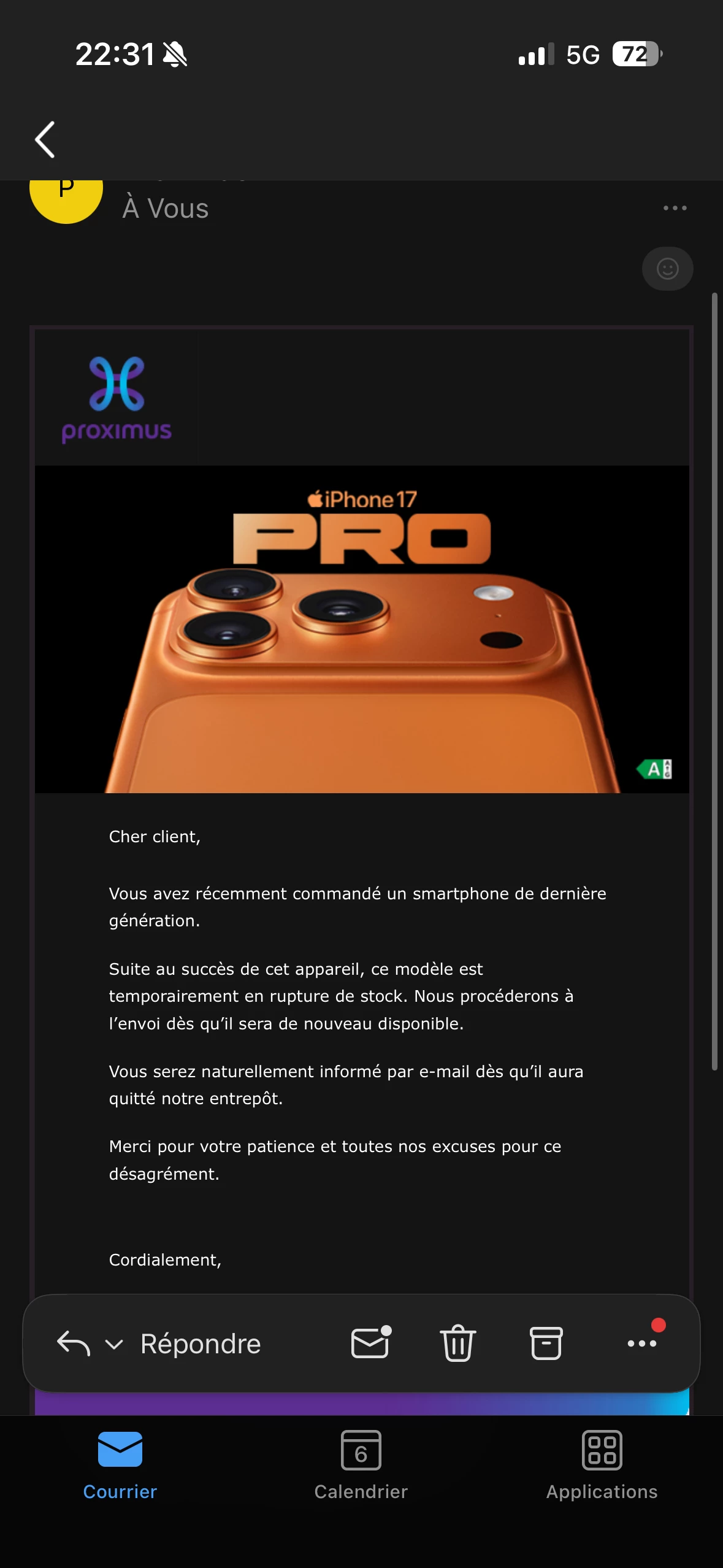 Bonjour, mail reçu de la part de Bpost hier soir vers 19h. Je suis censé le recevoir aujourd’hui. Iphone 17 white 256GB commandé le 18/09 (j’avais bien reçu le fameux mail automatique du lundi soir)...