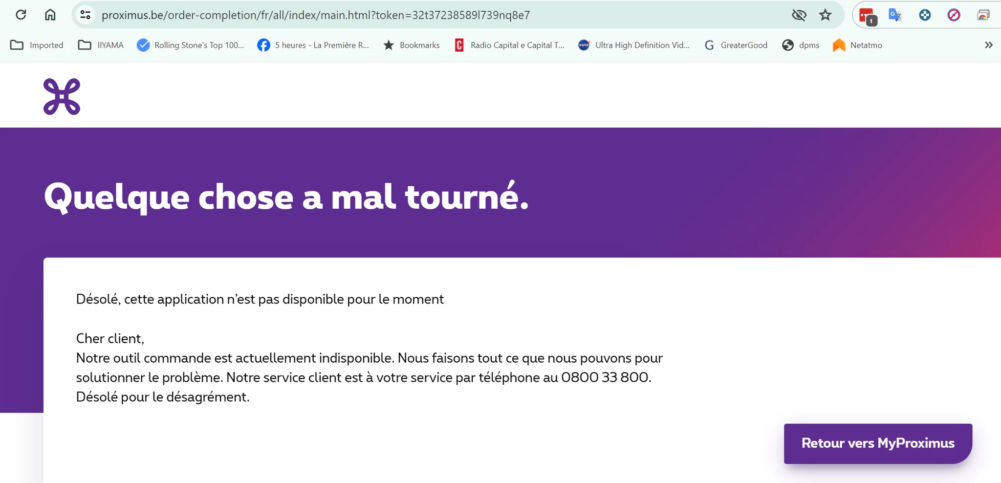 Je recois un SMS avec un lien pour terminer la commande→ le lien ne fonctionne pas (voir annexe). Je recois aprés le meme lien par e-mail. Et la, il y a eu un malentendu. Visiblement le premier responsable clientele n’a pas retenu l’adresse a Laeken (ou je voulais recevoir le telephone et la fibre) mais a gardé l’adresse de mon dossier (a Etterbeek) ou il y a dejá la fibre Proximus.