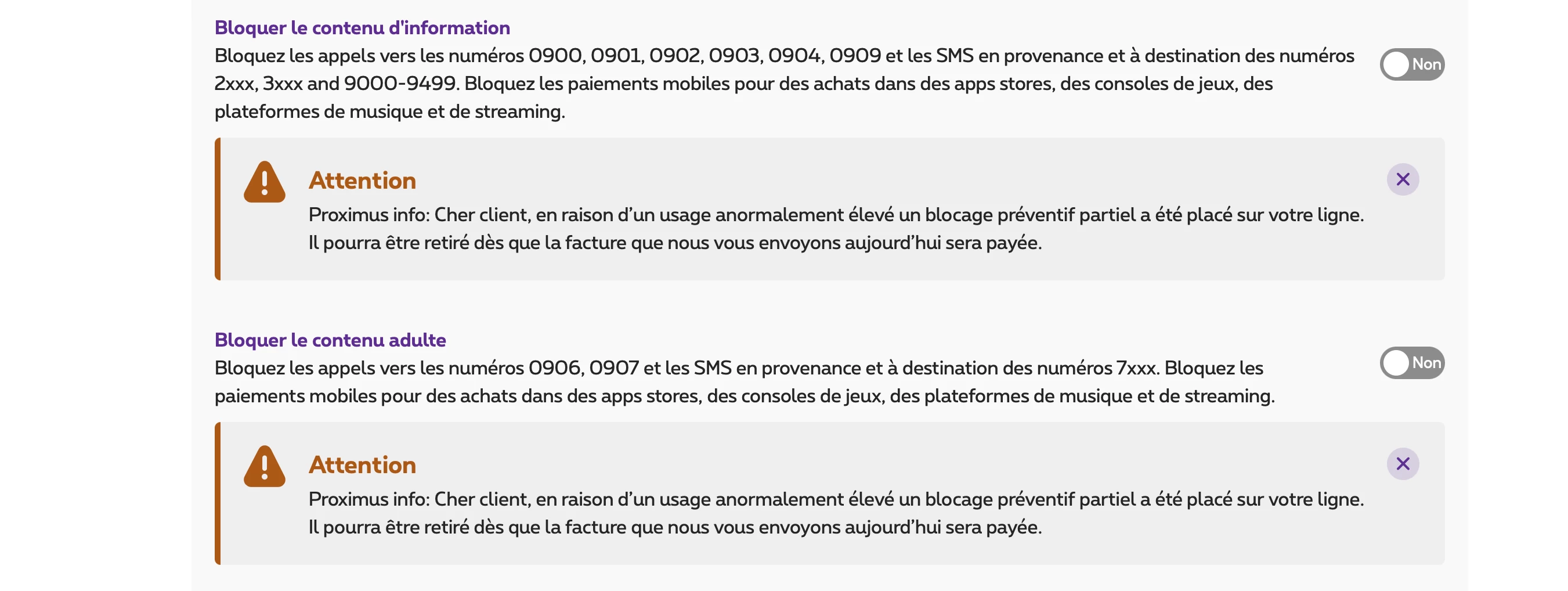 dans les 3 abonnements mobile de mon pack, je me heurte à un message d’erreur concernant un usage anormalement élevé qui pourra être retiré lorsque la facture envoyée sera payée. (voir également capture d’écran ci-jointe).