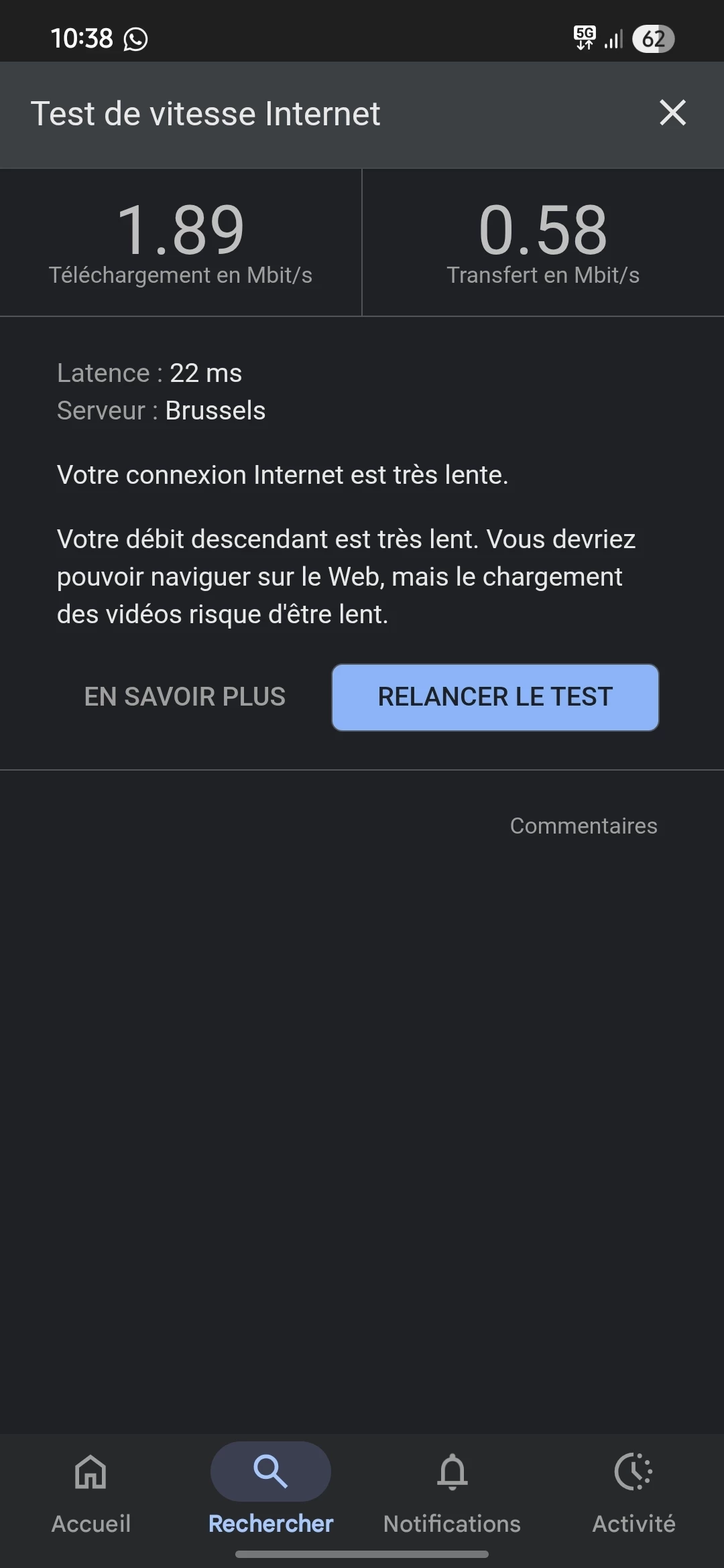 Depuis les travaux afin d'améliorer la qualité du réseau, c'est la catastrophe. Je passe régulièrement de 5G à Edge, ce n'était pas le cas avant. Que je sois dehors ou dedans, Idem. Ce matin, speedtest à l'extérieur, 5G et 3 barres, résultat, 1,3 Méga en download.