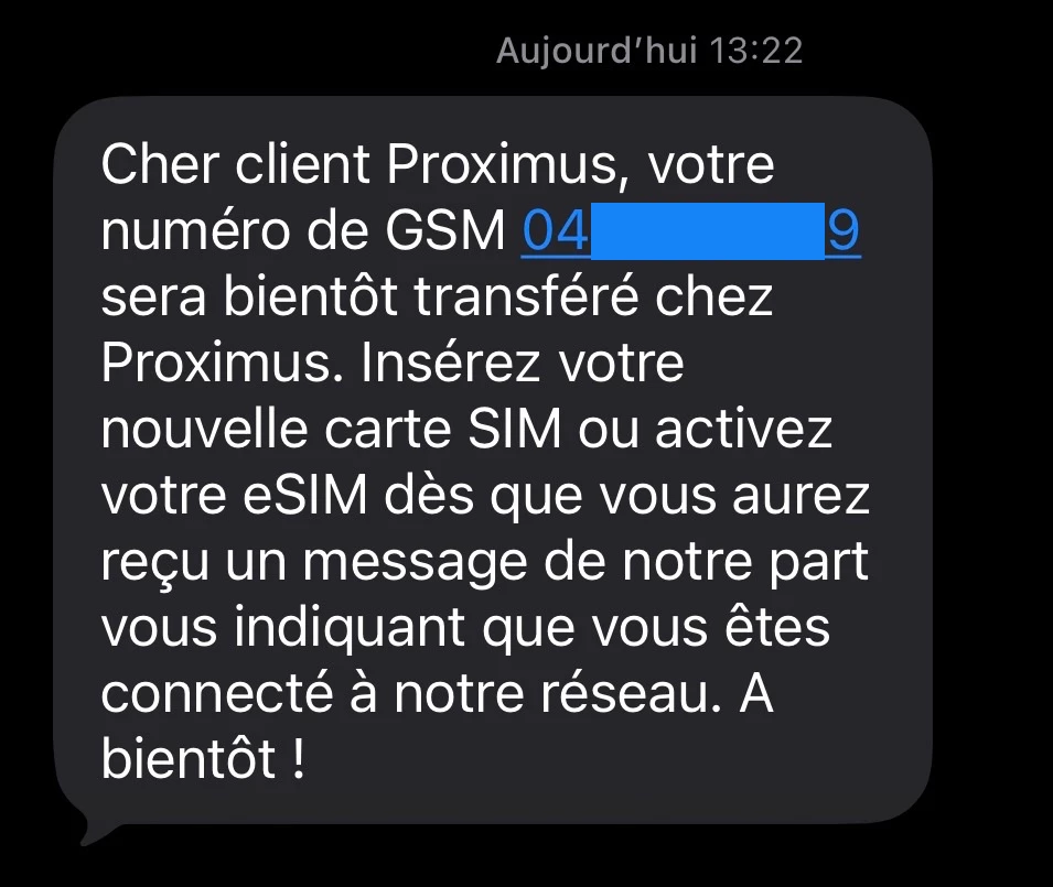 Nous sommes aujourd’hui le 19 décembre et j’ai reçu, aux alentours de 13h, un SMS (voir pièce jointe) m’indiquant que mon numéro allait prochainement être transféré. N’ayant toutefois pas reçu d’informations complémentaires concernant la date ou l’heure estimée du transfert, je souhaitais simplement obtenir quelques précisions à ce sujet. J’ai également tenté de joindre le service client, mais il m’a été difficile d’obtenir une réponse claire.