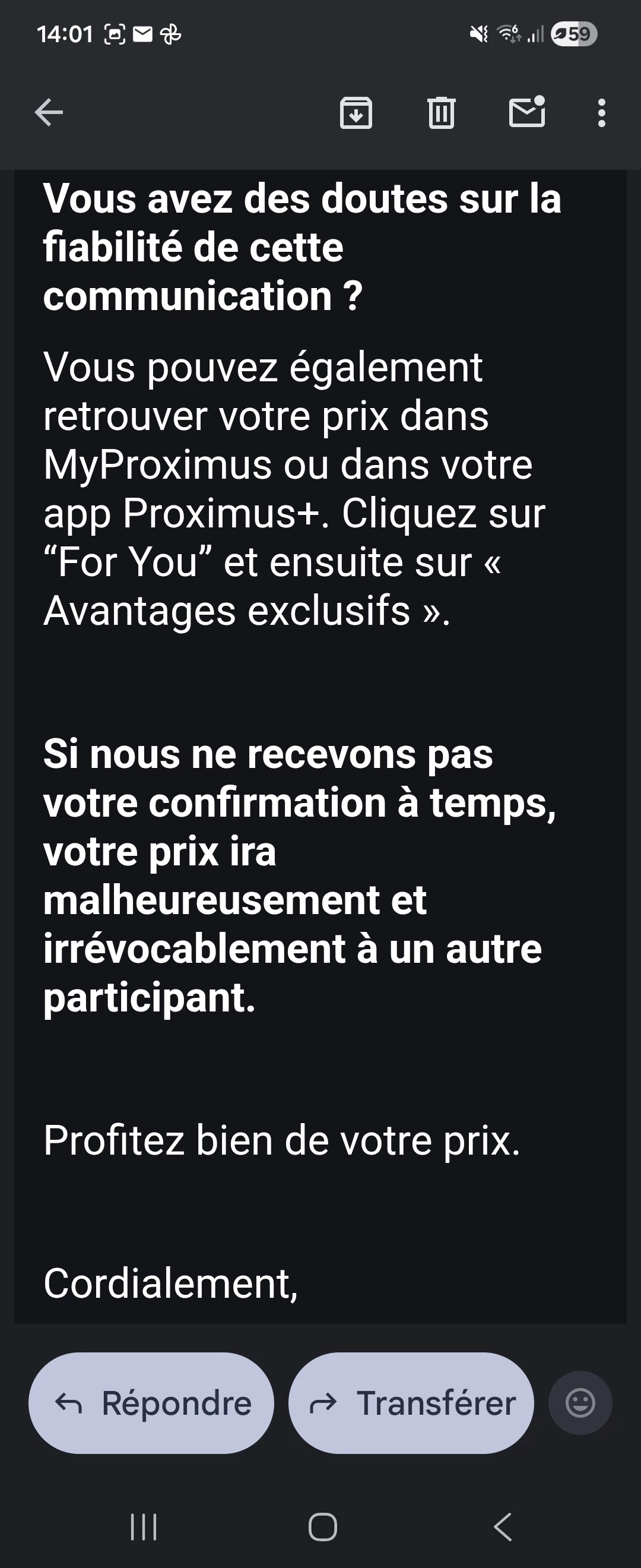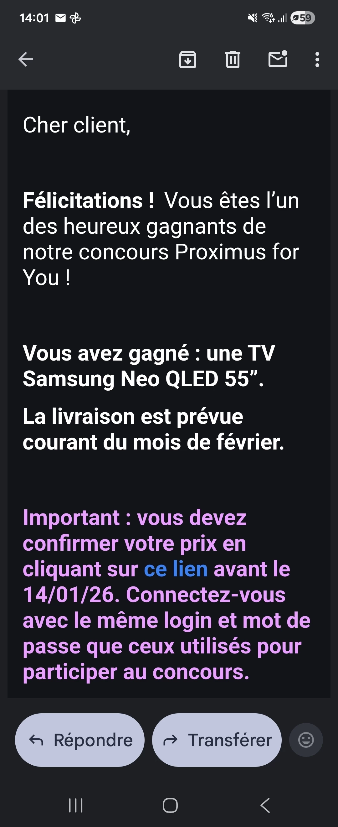 Hier j ai un mail m indiquant un gain au concours que j ai effectivement fait un décembre concernant une télévision Samsung le 11/12, quelqu'un peut-il me dire si effectivement cela est réel ou pas